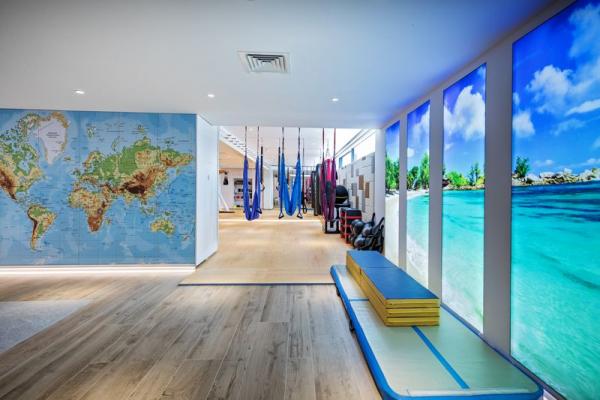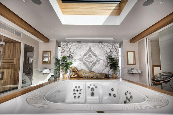 Outdoors, the property invites relaxation and enjoyment, with open and covered Balinese-style chill-out terraces, a 25-meter-long infinity pool with a depth of 4 meters and a jacuzzi, a climbing wall, a high-quality sports court, a professional trampoline, a wooden playhouse, a high-end gas BBQ, and various areas designed for relaxation and unforgettable moments.