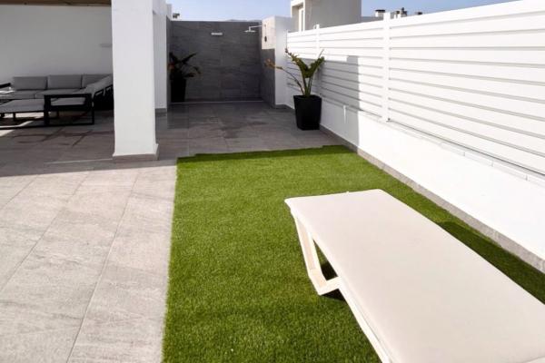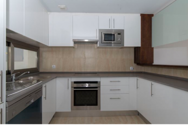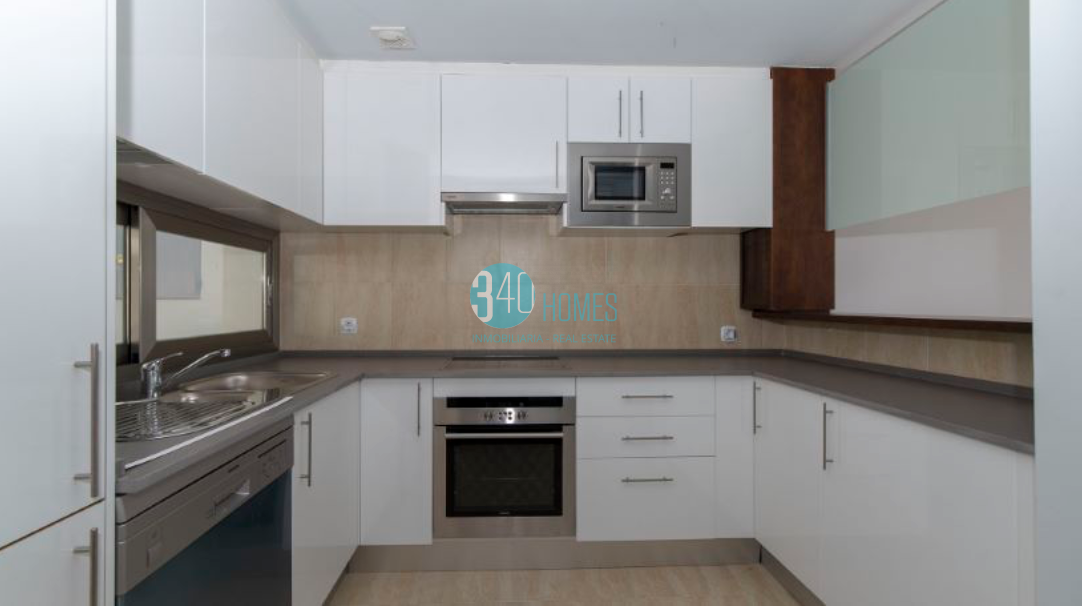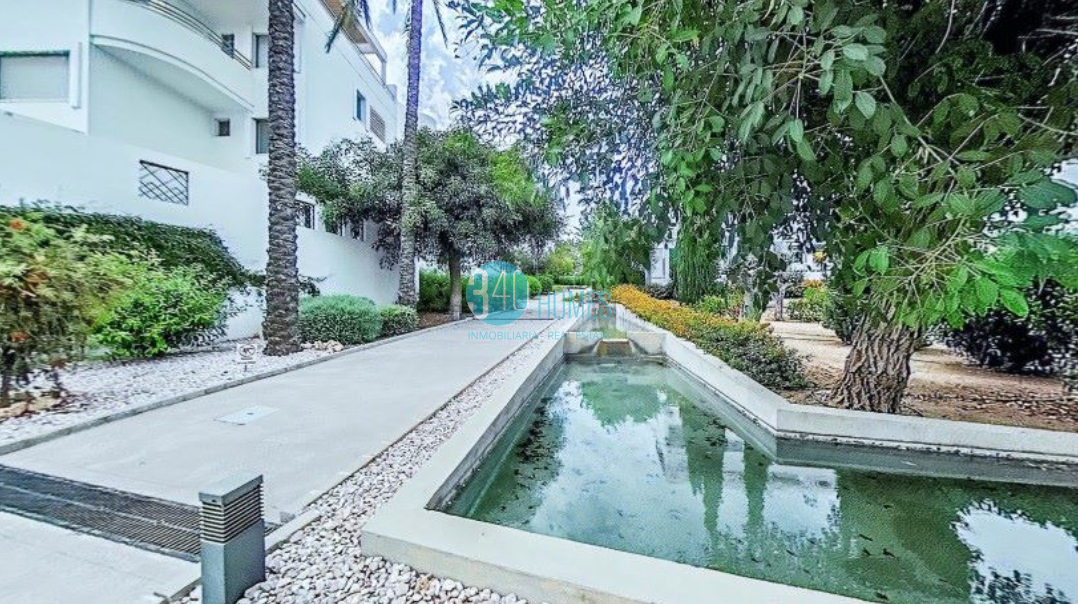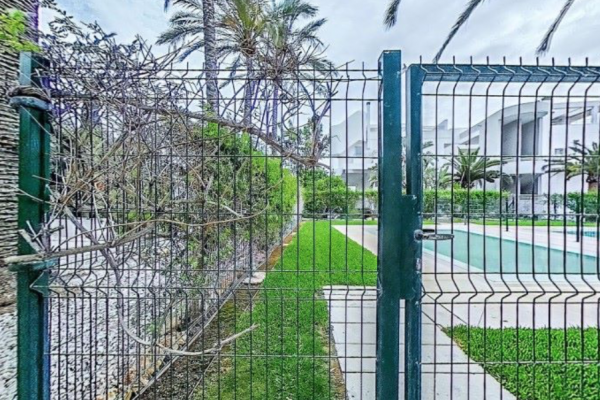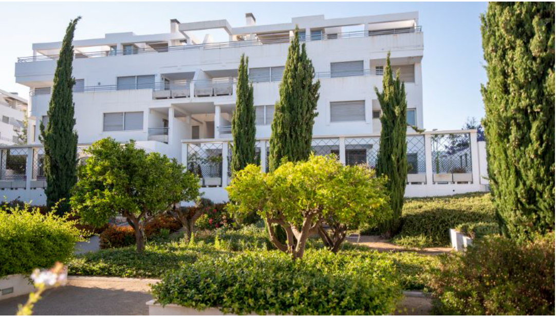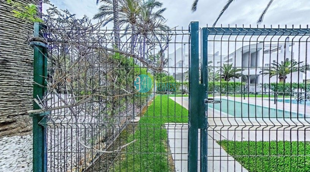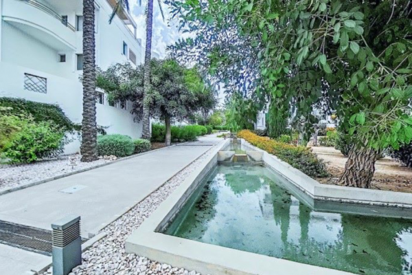 The residential complex is a true oasis, boasting three communal swimming pools surrounded by beautifully maintained gardens, perfect for relaxing and enjoying the Mediterranean climate. For added convenience, the building is equipped with an elevator, making access easy to all areas.