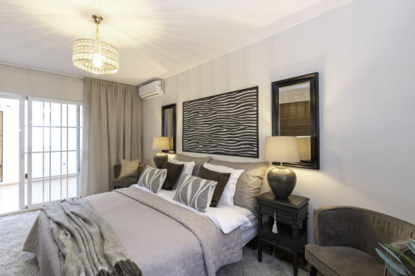 El exterior es un auténtico oasis: un jardín maduro con riego automático, piscina salada privada, zona chill-out y aparcamiento para varios vehículos.